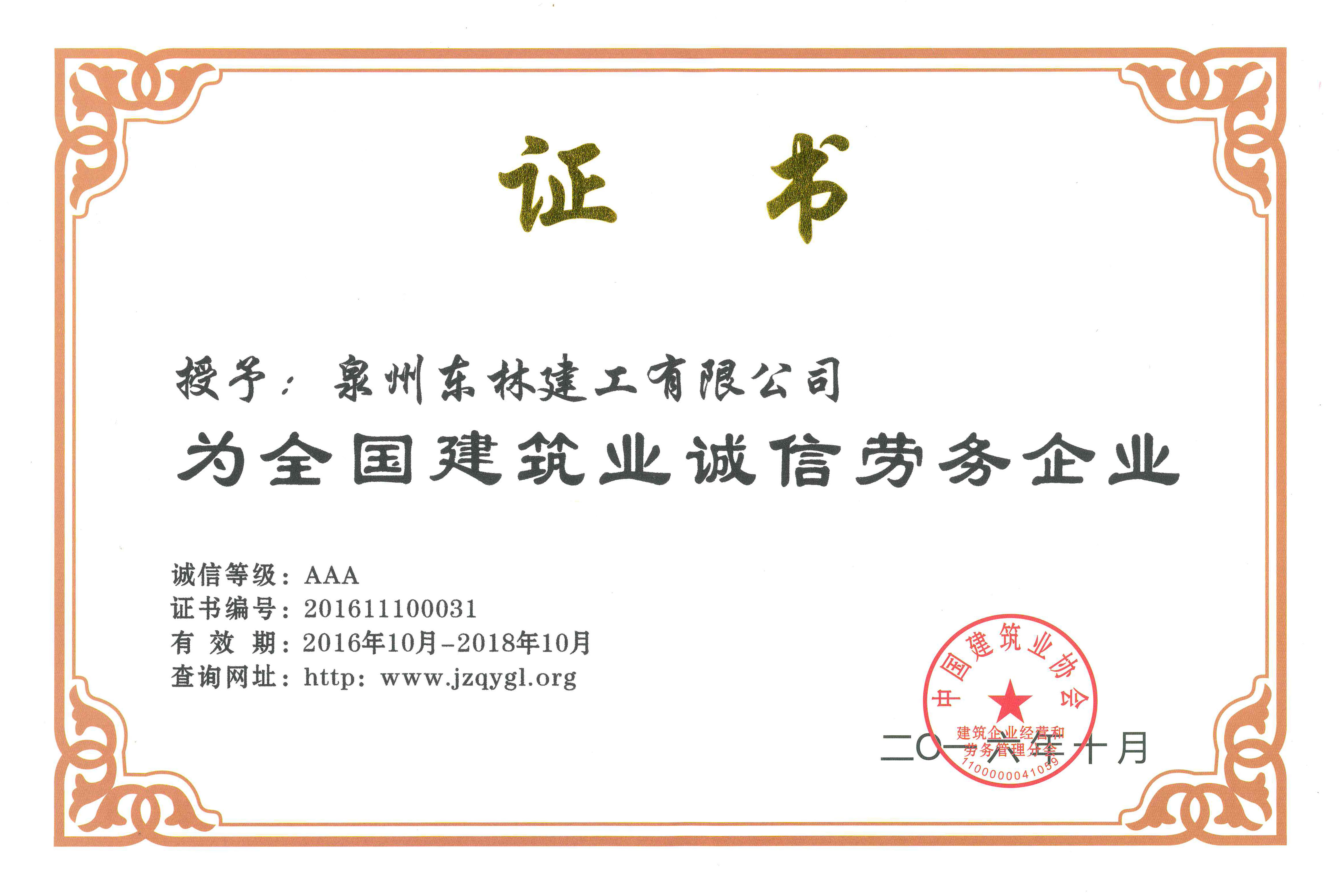 2016-2018年度泉州东林建工全国建筑业诚信劳务企