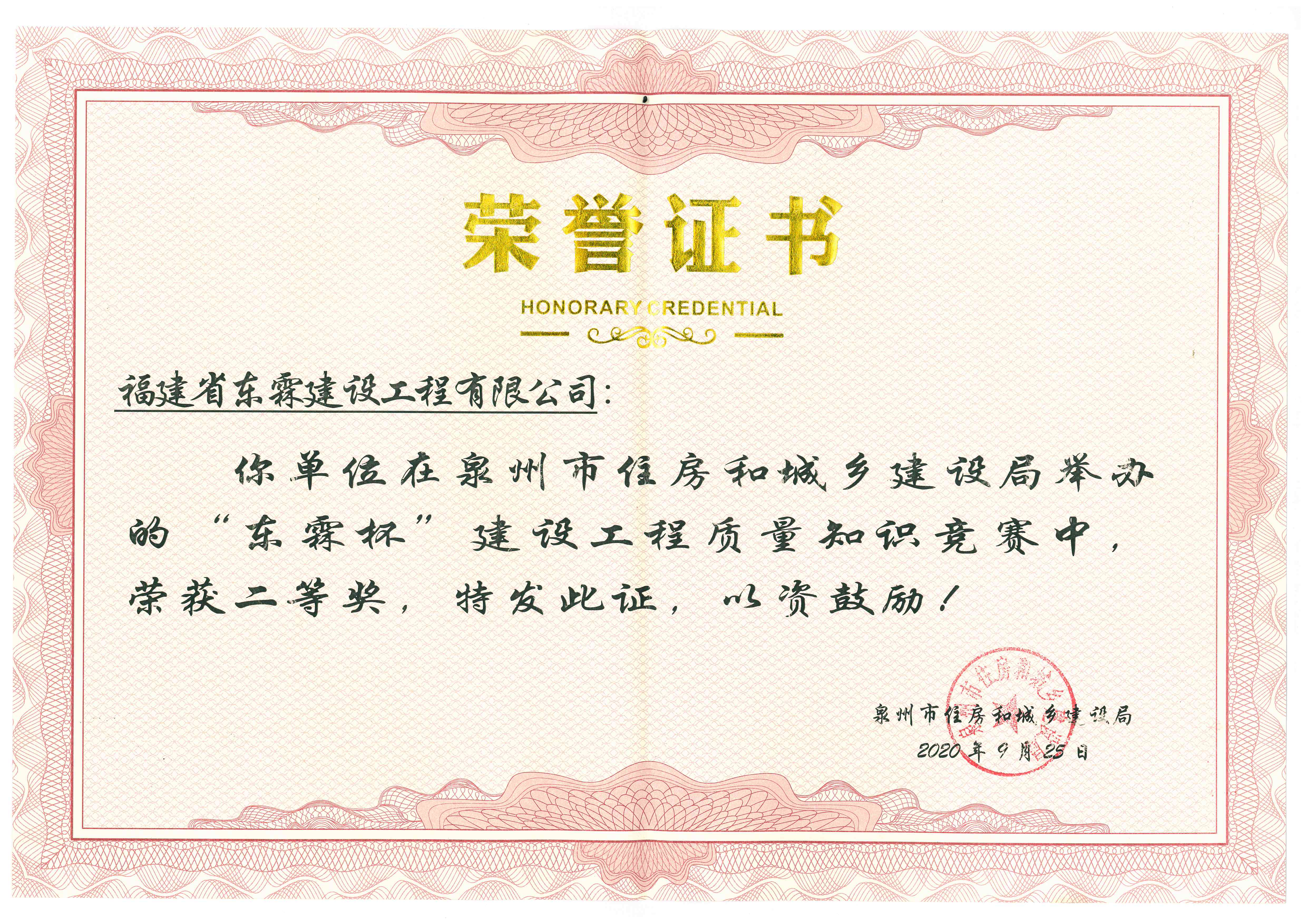 泉州市“东霖杯”建设工程质量知识竞赛二等奖