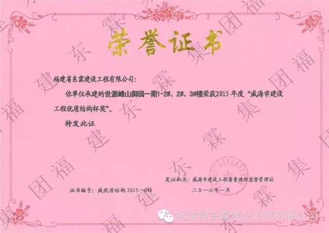 世源峰山御园一期1-2#、2#、3#楼工程被威海市建设工程质量造价监督管理站评为2015年度“威海市建设工程优质结构杯奖”