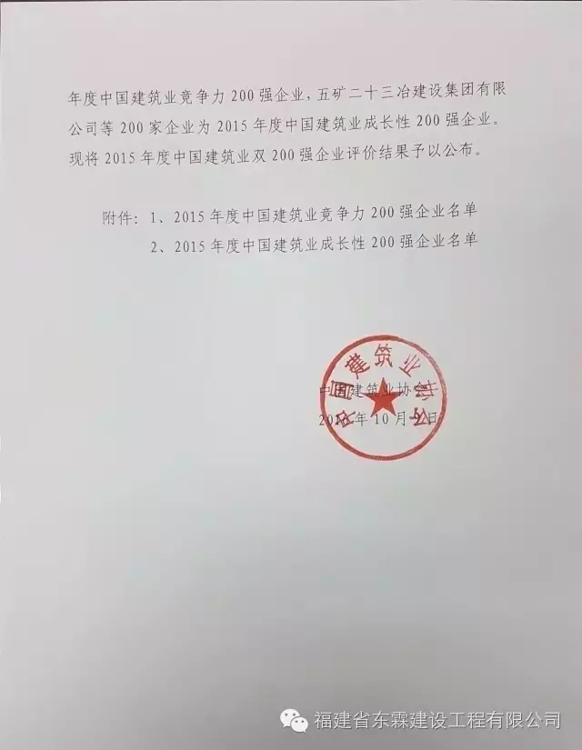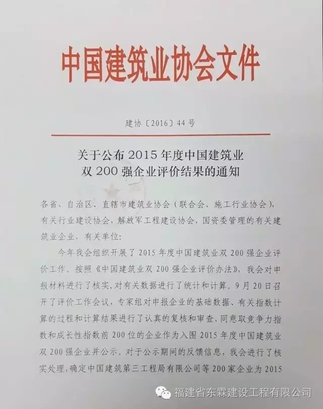 由中国建筑业协会组织开展的2015年度中国建筑业协会双200强评价结果于2016年度10月9日揭晓,确定福建省东霖建设工程有限公司入围2015年度中国建筑业成长性200强企业,位列全国第138位,为欧亿网页版公司再添殊荣。