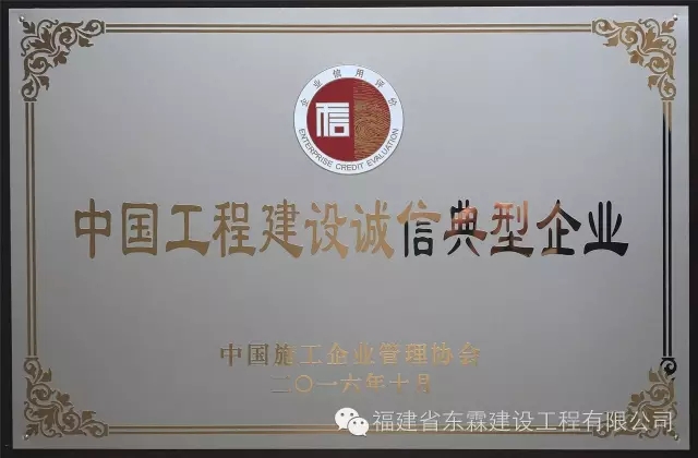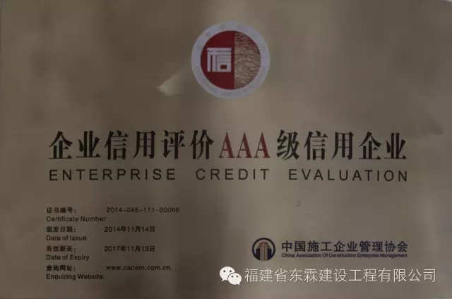 中国施工企业管理协会信用评价工作委员会通过申报、推荐、审核、公示,对福建省东霖建设工程有限公司进行综合评价,2016年度审核合格,继续保留原有社会信用AAA等级。