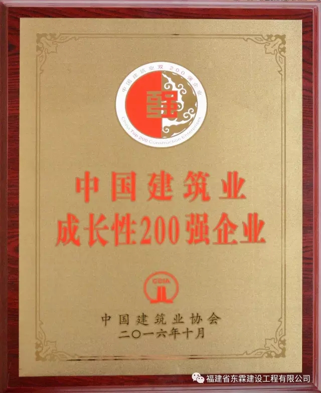 福建省东霖建设工程有限公司荣获2015年度中国建筑业成长性200强企业,位列中国建筑业成长性企业第138位。
