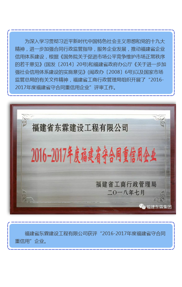 东霖企业获评2016-2017年度福建省“守合同重信用